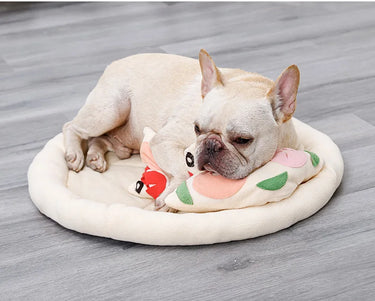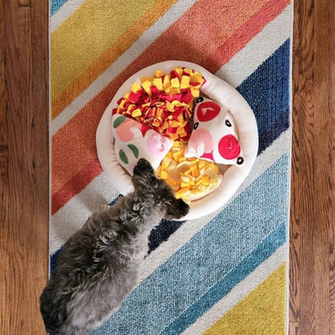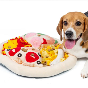 The Dog Heaven™ Pizza Mat is a fleece snuffle mat made for interaction and exploration! Hide kibble or treats in the different quarters of the pizza so your dog can investigate and dig around, giving it mental and physical stimulation during the quiet parts of the day. Two of the pizza quarters also act as squeaky toys!